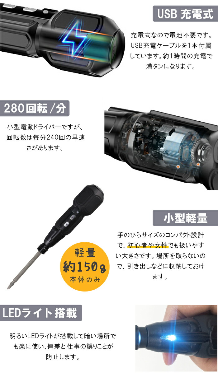 電動ドライバー ビット10本セット 小型 軽量型 ドライバー パソコン 組立 メンテナンス 高輝度LEDライト付き 充電式 コードレス 女性 六角スペーサー 専用ビット 細長いビット Cyberplugs